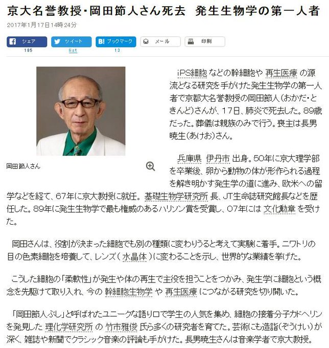 【心からお悔やみ申し上げます】京大名誉教授・岡田節人さん死去 発生生物学の第一人者:朝日新聞デジタル www.asahi.com/articles/ASK15… 「役割が決まった・ニワトリの目の色素細胞を培養して、レンズ・に変わることを示し・幹細胞生物学や再生医療につながる研究を切り開いた」
